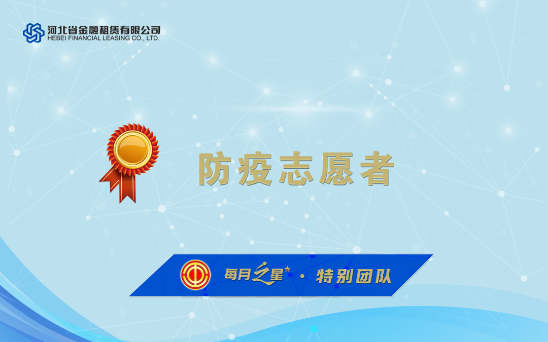 8月份,河北金租一方面抓業(yè)務促投放,積極創(chuàng)新業(yè)務模式和打磨服務產(chǎn)品,一方面積極落實區(qū)域防疫政策,以責任傳遞租賃溫度,為疫情防控貢獻力量。工會委員會評選出本月“每月之星”,請優(yōu)勝團隊和優(yōu)秀員工珍惜榮譽,再立新功,請全體干部員工以先進為榜樣,再接再厲,再創(chuàng)佳績